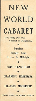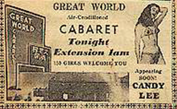 Arguably the most popular attraction in both New World and Great World were their cabarets. These opened around 7 pm, closing on midnight during the week and 1 am on Saturdays. In the 1930s, admission fee was between 50 cents and one dollar.