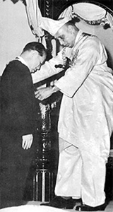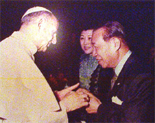 The Pope greets Runme Shaw as Mrs Shaw looks on, Singapore
