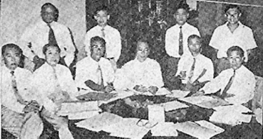 Shaw management meeting: Top (from left) Gopi (stenographer), Lee Kee Yin (Chin Kim Fook's secretary), John Foo, PS Chia. Bottom (from left) Chin Kim Fook, Chow Deh Kong, Chin Kim Meng, Ng Chong Fatt, Run Run Shaw and Runme Shaw