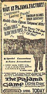 "Free admission for couples in pajamas!" Promotion for 'The Pajama Game', a 1958 movie which starred Doris Day.