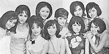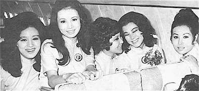 (from right) Tina Chin Fei, Ivy Ling Po, Betty Ting Pei, Ching Li and Lily Ho playing air hostesses going to Taipei in 1970